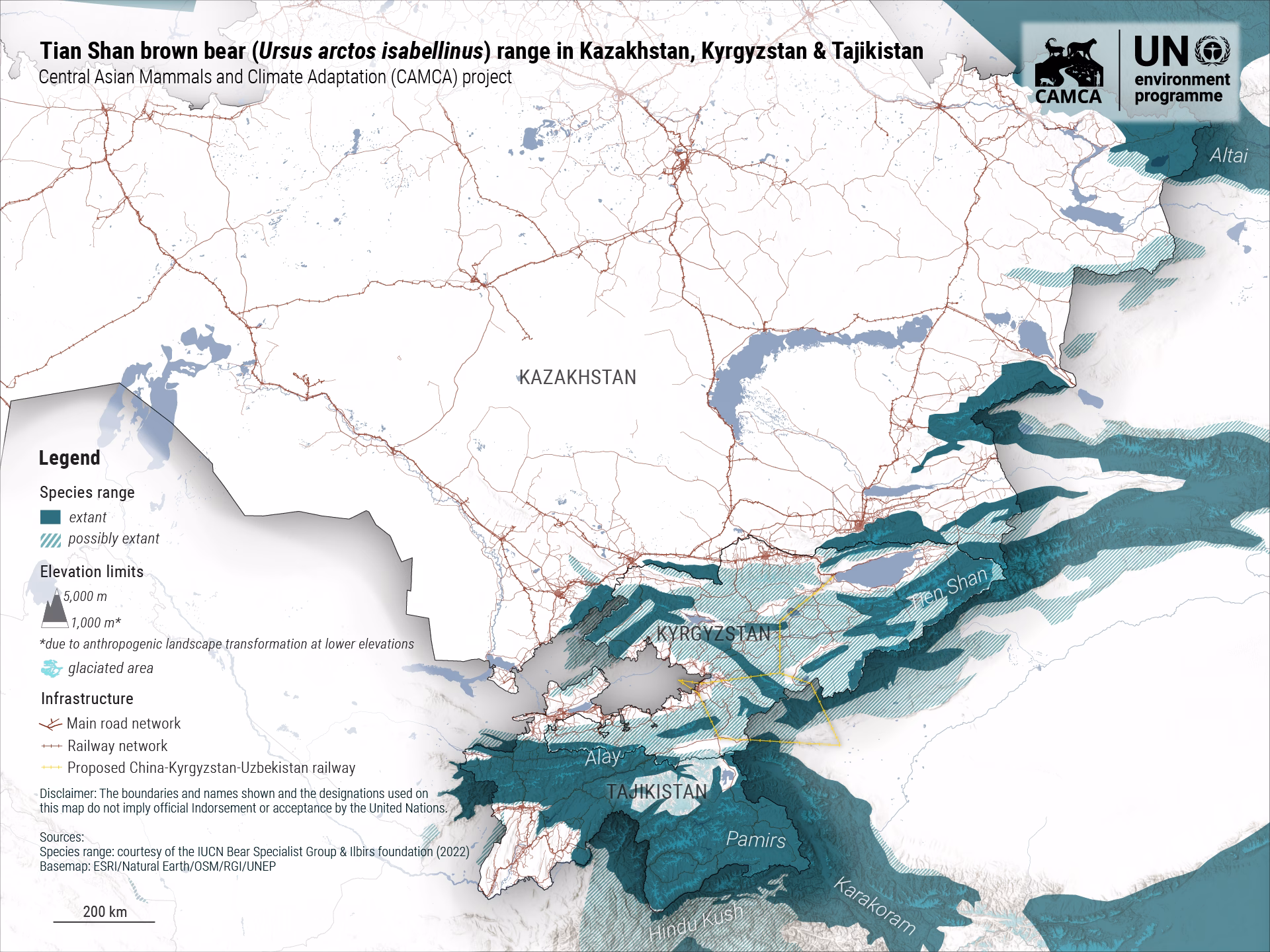 In Kazakhstan, Kyrgyzstan, and Tajikistan, the Tian Shan brown bear, Ursus arctos isabellinus, a subspecies of brown bear, is broadly distributed across the region. This bear inhabits lowlands and highlands from the elevation of 1000 m to 4700 m. There are almost no bears present in areas below 1000 m due to extreme anthropogenic transformation of the landscape. There are also no bears over 5000 m due to a lack of food sources. Analysis shows that the density of bears varies depending on the elevation and habitat characteristics in Kazakhstan, Kyrgyzstan, and Tajikistan. In Tajikistan, the highest density is found in the Hissar-Alay mountain system and the lowest density in the Western and Central Pamir mountains. Small populations are found on the high plateau of the Eastern Pamirs. In Kyrgyzstan, the highest density of brown bear inhabits the Central, Inner and West Tian-Shan and a smaller number is found in other mountains of Kyrgyzstan. In Kazakhstan, this brown bear occurs in the West and North Tian-Shan but has disappeared from the Karatau range. It also inhabits the Zhongar Alatau mountains. The brown bears of Northern Kazakhstan and the Altai mountains do not belong to this subspecies.